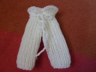 Ľavú nohavicu začneme pliesť na 24 očiek pružným vzorom - 1 očko hladko, 1 očko obrátene. Upletieme do výšky, aké chceme dlhé nohavice. Potom uzavrieme na každej strane po 2 očká a pletieme ešte 16 radov pružným vzorom. Pletenie uzavrieme.