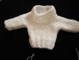 Diely zošijeme na ramenách do tvaru "+". Háčikom obháčkujeme priekrčník. Ja som háčkovala 6 radov krátkymi stĺpikmi. Zošijeme rukávy a diely spolu do tvaru pulóvra. Ak sa Vám zdajú rukávy krátke, môžete ich teraz po zošití ešte obháčkovať 1 alebo 2 okruhmi krátkych stĺpikov.