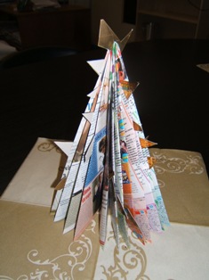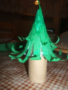 Stromček sme trochu rukami upravili,aby sa listy časopisu rovnomerne rozložili a položili sme ho na chodbe na poličku ako peknú ozdobu.