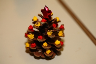Potrebujeme: šišku, farebné servítky, nožnice, disperzné lepidlo