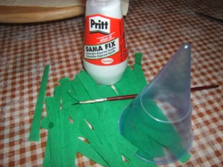 Potrebujeme: rolku od toaletného papiera, papierový kužeľ (my sme použili pohárik z umelej hmoty v tvare kužeľa, čo sme mali doma), disperzné lepidlo, krepový papier a nožničky