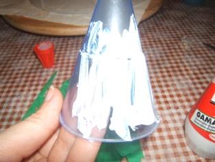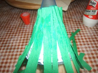 Na kužeľ natrieme lepidlo a od spodu nalepujeme kúsky papiera. Teza najprv ich nalepina v spodnej časti kužeľa, potom v strednej a nakoniec pri vrchole. Na vrchole potom papier prehneme do opačnej strany, aby sme obišli tvar kužeľa.