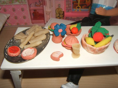 Pokračovali sme v tvorení. Bábika mala krásnu skriňu, ale na čo a ako do nej zavesíme šaty? Vymysleli sme. Mala krásne misky, taniere alebo hrnce, ktoré sme zohnali na burze, ale niečo do nich bolo potrebné aj uvariť - teda spraviť aj nejaké napodobeniny jedla, veď sa chceme hrať aj na raňajky...