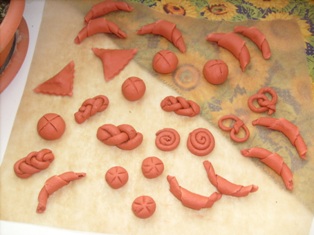 Tvarohový alebo lekvárový koláč: urobíme si guľku z hnedej hmoty, ktorú sploštíme na polovicu, na vrch položíme malú guľku bielu alebo červenú a spolu to sploštíme do kruhu.
