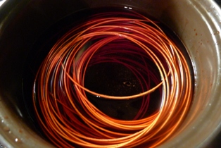 Najprv sme zohriali v hrnci vodu na 45°C. Naozaj sme teplotu odmerali. Použili sme 4 litre vody. Vsypali sme farbu a premiešali. Potom sme priliali 4 polievkové lyžice octu. Vložili sme prúty - asi 16 kusov. Prikryli sme pokrievkou a nechali stáť - proste sme zabudli. Vybrali sme z vody asi po 2 hodinách. Prepláchli pod tečúcou vlažnou vodou a začali pliesť.