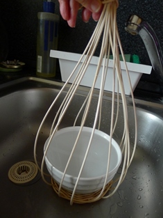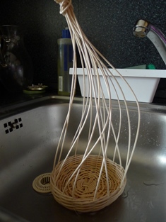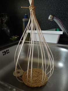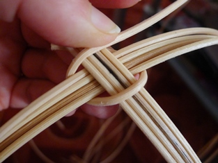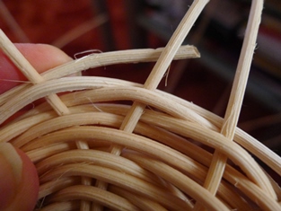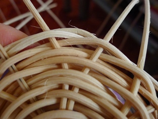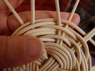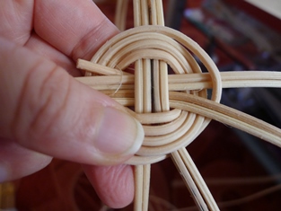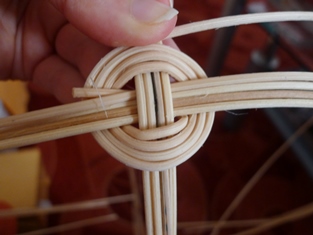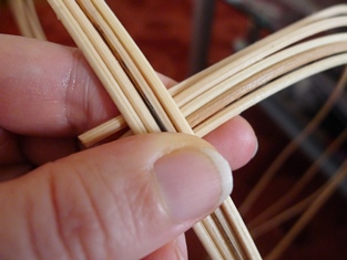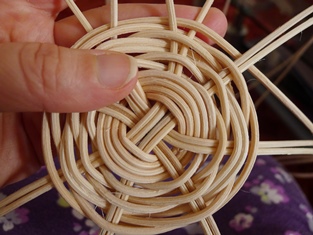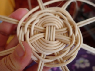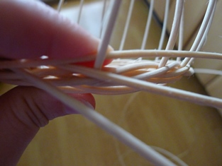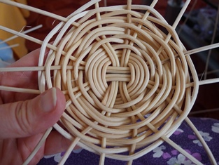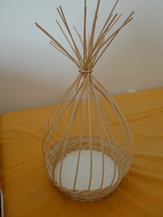 Obpletieme tromi prútmi hrúbky 2,5 ako sme zvyknutí (http://www.dobre-napady.sk/pre-deti/tvorime-s-detmi/644-pletiem-kosik-6). Ibaže teraz musíme prúty prepletať cez zviazané osnovné prúty.