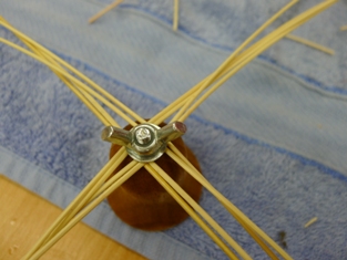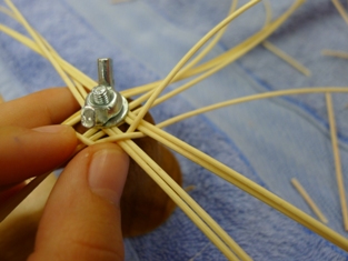 Navlhčené - namočené prúty asi 15 minút vo vlažnej vode sme si nastrihali. Najprv sme si prichytili po dva a dva prúty dĺžky 20 cm skrutkou v strede tak, aby sme vytvorili kostru na prvom obrázku. Jeden dlhý prút sme prehli na polovicu a začali omotávať okolo osnovy alebo kostry.