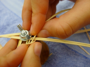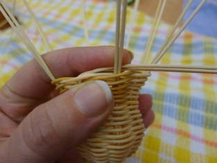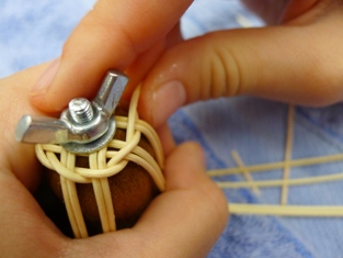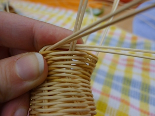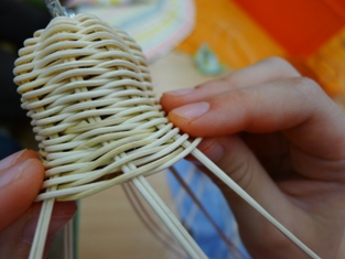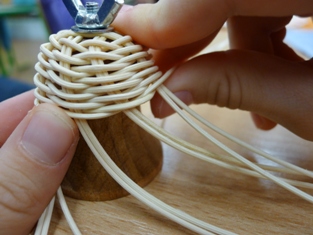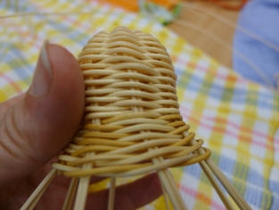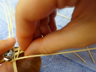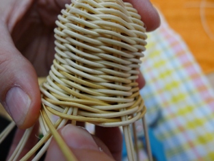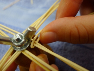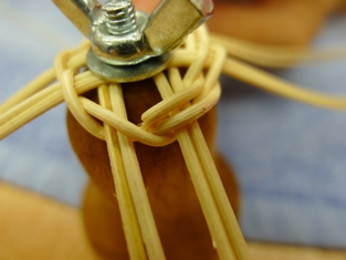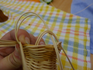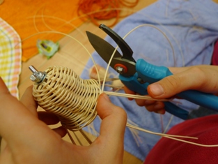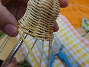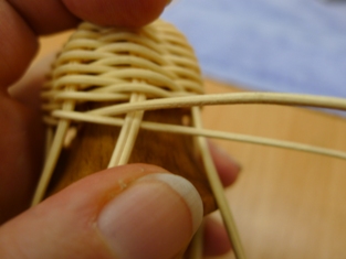Teraz sme začali ukončovať pletenie zvončeka. Odstrihli sme si dlhý prút, ktorý sme obtáčali okolo kopýtka a konce pomocou šidla vtlačili pod pletenie ku najbližšej časti kostry. Takže v jednej časti to vyzerá na zvončeku akoby tam boli nie dva, ale tri prúty.
