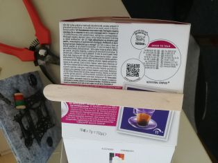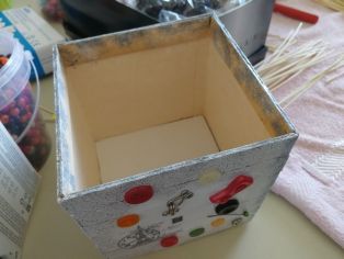 Odmeriame si paličky na veľkosť škatuľky. Zastrihneme nožnicami na prútie podľa nameranej časti. Škatuľku potrieme Duvilaxom a popriliepame paličky. Lepíme len po bokoch. Vrchné uzatváranie zostrihneme. Necháme zaschnúť. Potom popriliepame paličky aj na dne. Stále lepíme na povrchu škatuľky. A znova necháme zaschnúť.