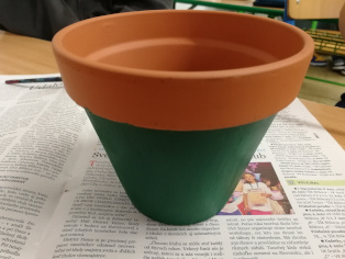 Potrebujeme hlinené kvetináče, kamienky, zeminu, akrylové farby, ploché jemné štetce, disperzné lepidlo.