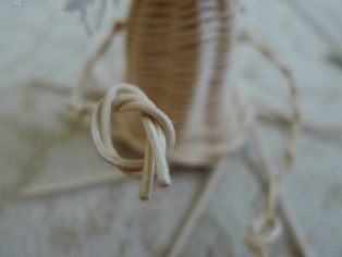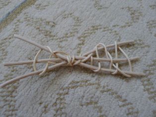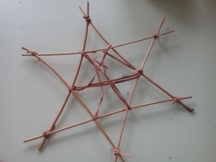Z prútia odrežeme šesť rovnakých kusov. Tri a tri spolu zviažeme tenkým plochým pedigom, ktorý sme ozaj dobre namočili, aby pri uzlení nepraskol. Potom trojuholníky prekrížime a zviažeme spolu, prípadne prekrížené časti trojuholníkov vyplníme rovnakým pedigom ako sme uzlili. Ak urobíme hviezdu veľkú môžeme ju dekorovať na stenu či dvere alebo okno.