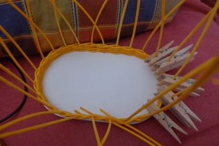 Po dlhšej prestávke už zase pletieme košíky asi týždeň. Vlastne sme začali pre tie farebné drevené korálky. Včera sme vyskúšali pletenie aj pomocou štipcov - museli sme, minuli sa nám korálky.