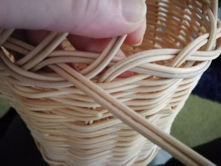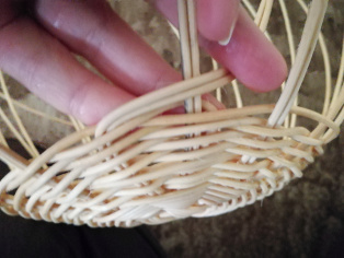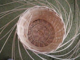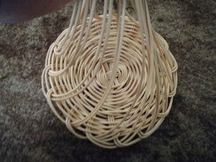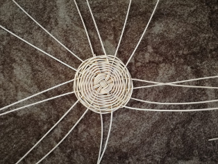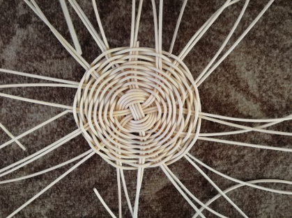 Upletieme počiatok dna japonskou technikou. Potom vložíme ku každému osnovnému prútu ďalší dlhý a obpletieme technikou Silvia. Ak si dobre pozriete druhú fotografiu, môžete si hore všimnúť, že sa nám jeden prút zlomil a museli sme takto nahrádzať. Ak sa vám také niečo stane, určite zasuňte prút aspoň pod dva predošlé obpletené a ešte aspoň dvomi obpleťte.