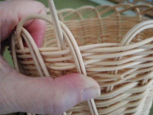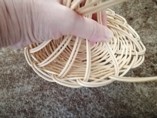 Ukončujeme. Budeme robiť uzávierku. Tentokrát vrkočovú. Pozorne pozerajte fotografie. Prehneme osnovné prúty prehneme okolo najbližšieho vpravo. Dávame pozor na to, aby ste neprekrížili prúty. Posledný prút vložíme do prvého prehnutého, čím uzavrieme okruh. Prúty potom potlačíme dolu. Dávajte pozor, aby boli dostatočne mokré.