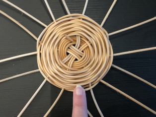 Pripravíme si mokré tri dlhé žlté prúty a začneme obpletať osnovu. V treťom okruhu z pravej strany vpichneme ku každému osnovnému prútu ešte jeden suchý. Košík namočíme a pokračujeme v obpletaní bokov košíka. Pridaním ďalšieho prútu v osnove spevníme boky košíka.