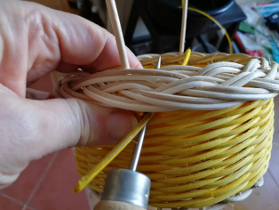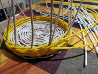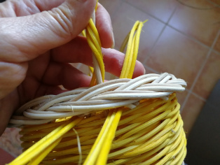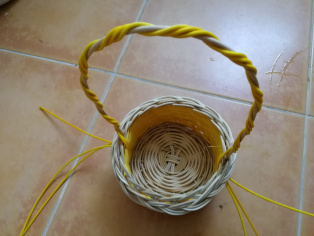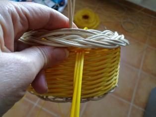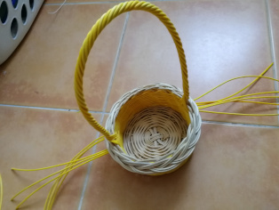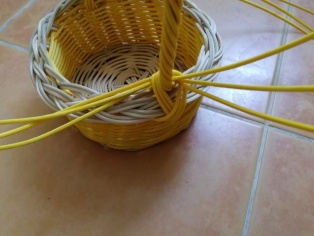 Do košíka zapichneme pedig hrúbky 4,5 mm. Dĺžku si vyberieme podľa seba. Potom ju začneme obpletať tromi dlhými žltými prútmi z každej strany.