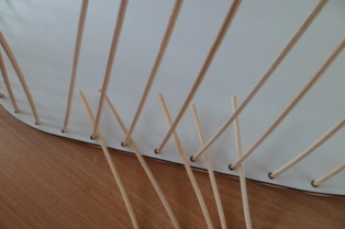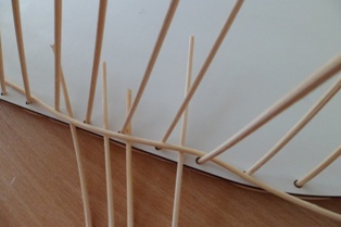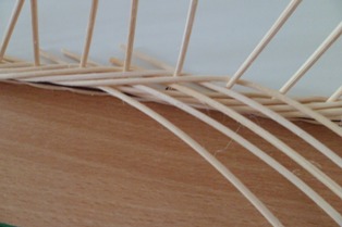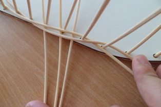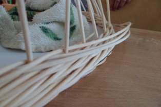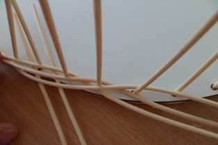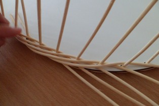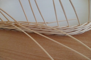Začneme piatimi prútmi. Upletieme dva rady. potom ukončíme den prút pomocou vpichovátka. Dva rady upletieme štyrmi prútmi. Pomocou vpichovátka vložíme ku každému osnovnému prútu ešte jeden, aby sme mohli nakoniec urobiť vrkočovú uzávierku. Pokračujeme pletením tromi prútmi zase dva rady. Jeden prút ukončíme a upletieme dva rady dvomi prútmi.