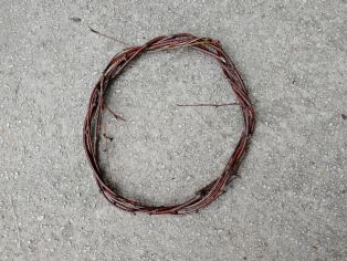 Jeden dlhší prút - nie je to vlastne ani prút, lebo z neho ešte vyrastajú kratšie jemnejšie konáriky, stočíme do kruhu. Potom začneme omotávať tento kruh prútmi opletkom na štyri body. To znamená, že približne do štvorca stáčame prút a obtáčame okolo.