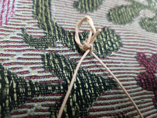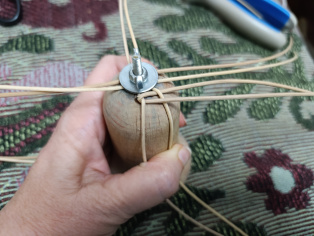 Na jeden košíček zauzlíme očko., aby sme neskôr mohli zavesiť na stromček. Potom pospájame oba "košíčky".