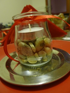 Po návrate z letnej dovolenky sme si doniesli námet z jednej reštaurácie. Do pohára sme nasypali kryštalickú soľ a trochu zaliali vodou tak, aby ju nebolo pod soľou vidieť. Na vrch sme položili čajovú sviečku.