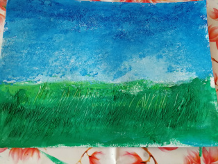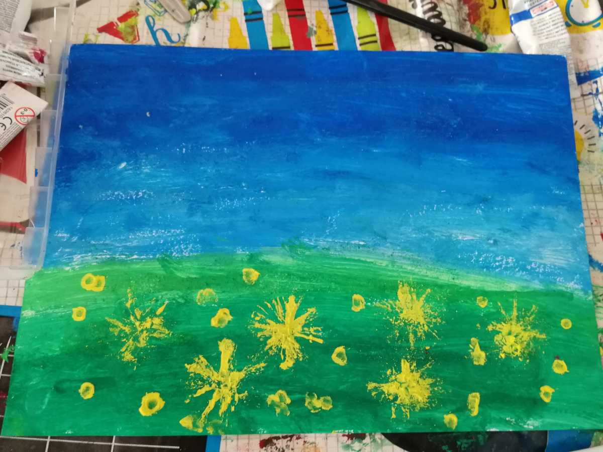 Výkres si otočíme na šírku. Vrchnú polovicu potrieme potrieme navlhčeným plochým štetcom hrubšou vrstvou modrou farbou. Spodnú polovicu podobne zelenou farbou. Zoberieme si hubku na riad a jemne ňou pocapkáme drsnejšou časťou modrú časť, čím vytvoríme dojem oblakov a oblohy. Zelenú časť tiež môžeme pocapkať alebo urobiť ryhy vidličkou a vytvoriť tak dojem trávy. Necháme dobre zasušiť. Potom vytvoríme pomocou vatových tyčiniek kvety.