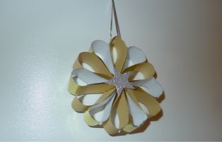 Zo strieborného a zlatého baliaceho papiera vystrihneme 12 cm dlhé a 2 cm široké pásy, ktoré zlepíme do kvetinky. Do stredu kvetinky potom nalepíme striebornú alebo zlatú hviezdu, ktorú sme vystrihli vykrajovačkou na papier.