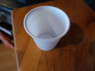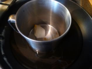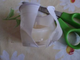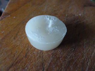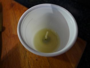 Rozpustíme si vo vodnom kúpeli vosk a vlejeme do menšieho pohárika, do ktorého vložíme knôt. Môžeme využiť takto staršie poháre z party alebo aj jogurtový téglik.