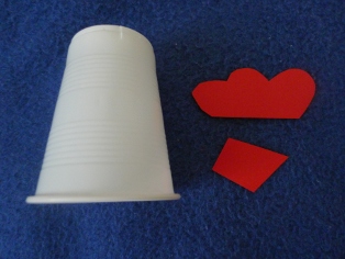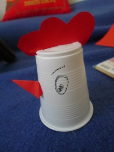 Pohárik na dne narežeme a zasunimle hrebienok. Podobne urobíme zobáčik. Nakoniec dokreslíme oči...