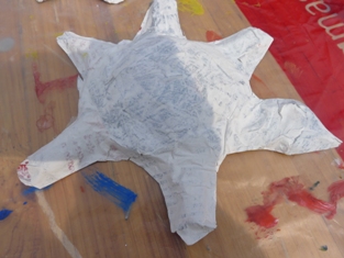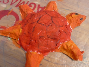 Formičku do piesku obaľte igelitom a nakašírujte - korytnačku alebo iné zvieratko. Neviete, čo je kašírovanie? Natrhajte noviny na kusy, namočte do tekutého škrobu. Obaľte povrch korytnačky a nechajte dobre zaschnúť. Potom ju zložte z formičky. A môžete maľovať temperovými farbami. Len ich nerieďte vodou.