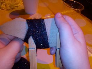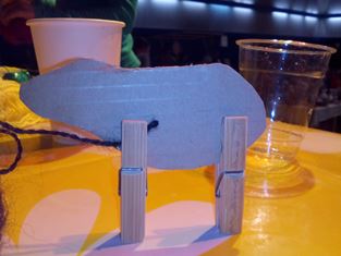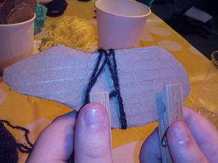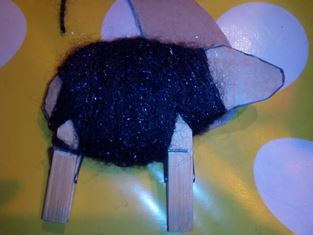 Z kartónu si vystrihneme tvar tela ovečky (občas sa nám podarí aj iné zvieratko) a na telo zospodu pripneme drevené štipce. Potom môžeme omotať bavlnu okolo tela a nakoniec dokresliť oko alebo papuľku...