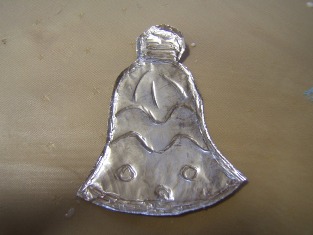 Potom opakom štetca - rúčkou - nakreslíme tvary ozdôb na poprehýbaný alobal. Necháme vyschnúť. Vystrihneme asi 3 mm okolo základného obrysu. A necháme úplne vyschnúť.
