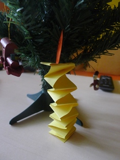 Zlepíme si dve strany novín - nie časopisu. Vystrihneme rovnoramenný trojuholník, ktorý skrčíme na harmoniku. Prípadne môžeme trojuholník vystrihnúť aj zúbkovanými nožnicami.Prepichneme špajlou, na ktorej vyrovnáme, aby sme vytvorili dojem stromčeka.