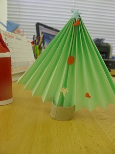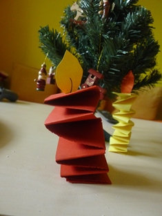 Zo zeleného papiera urobíme harmoniku. Prehneme na polovicu a zlepíme do tvaru trojuholníka. Na hlavnej strane trojuholníka urobíme mierne zárezy nožnicami a postavíme na zrezanú rolku z toaletného papiera. Na zelený trojuholník môžeme nalepiť farebné ozdoby vyrezané vykrajovačkou.