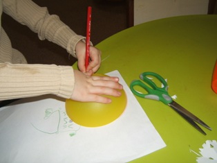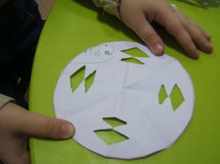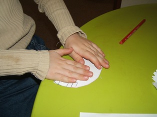Na papier si obkreslíme podľa pohára alebo misky kruh. Vystrihneme ho a poprehýbame. My sme ho prehli na polovicu a zase na polovicu a ešte raz na polovicu. Vznikol nám taký trojuholník akoby sme odrezali kus torty. Potom sme nožničkami na okrajoch urobili rôzne strihy alebo sme vystrihli kúsky papiera. Po rozložení sme mali krásnu snehovú vločku.