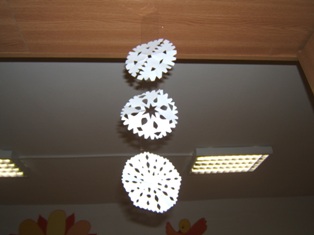Môžeme nalepiť priesvitnou lepiacou páskou na okno. My sme niekoľko vločiek nalepili na širokú lepiacu pásku a tú sme nalepili na strop miestnosti.