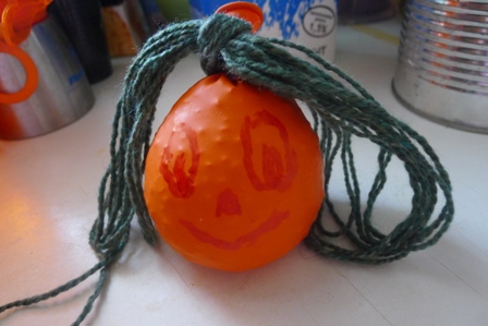 Naplnili sme oranžový balón suchým hrachom, zviazali zelenou bavlnou a prikreslili hrubou fixkou tvár. A hotovo!