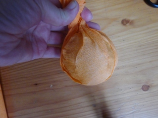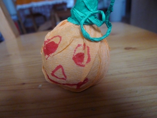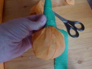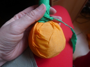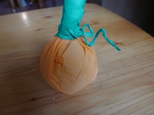 Potom guľu obalíme do oranžového krepového papiera a vrch omotáme zeleným, aby sme vytvorili dojem stopky. Ak chceme,môžeme domaľovať tvár.