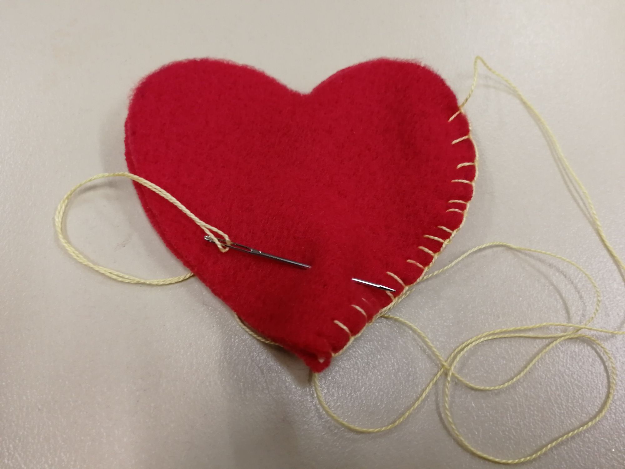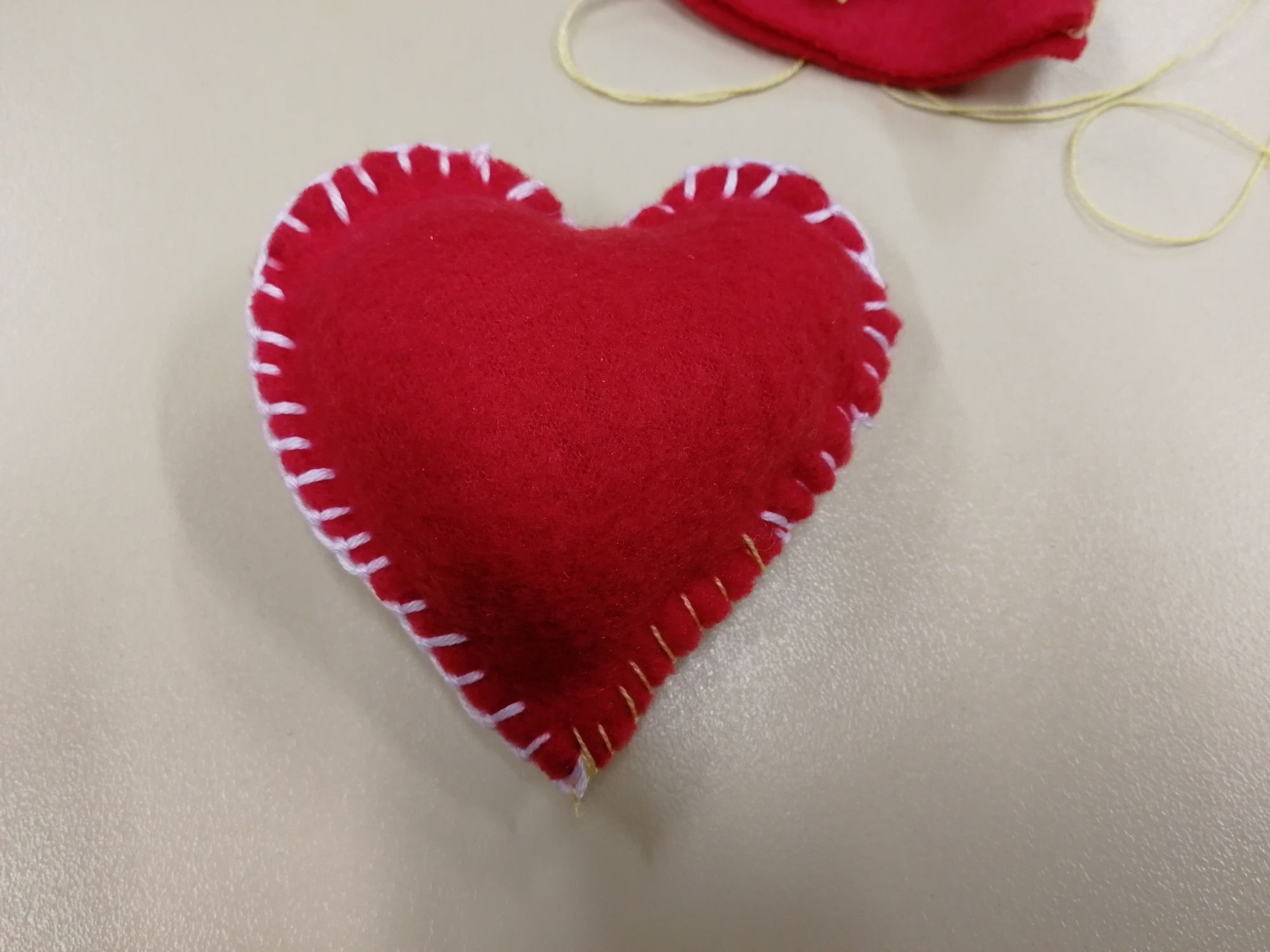 Srdiečka na seba priložíme a začneme obšívať. Srdiečko naplníme vankúšovou výplňou a doobšívame. Môžeme k nemu prišiť mašličku alebo šnúrku na zavesenie, či priviazanie do kytičky kvetov alebo ho aj priviazať ku špajli a priložiť do kytice kvetov.