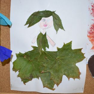 S mladšími školákmi môžeme robiť aj jesennú vílu. Vylisované listy prilepíme disperzným lepidlom na namaľovanú postavu na papieri tak, aby sme dotvorili šaty a vlasy.