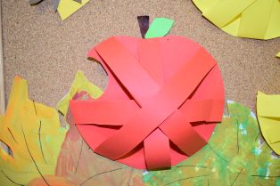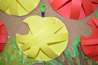 S mladšími školákmi môžeme obkresliť a vystrihnúť jabĺčka z farebných výkresov. Z farebných papierov vystrihneme pásy, ktorými prilepením na jablko budeme dekorovať - vytvárať 3D tvar.