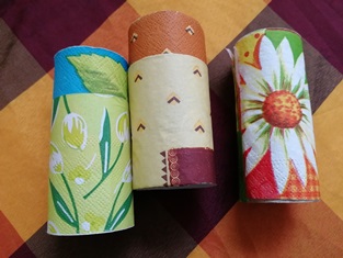 Najprv si oblepíme jednou vrstvou servítky rolku papiera. Necháme dobre zaschnúť. Potom prelakujeme a zase necháme dobre zaschnúť. Vložíme látkový servítok alebo väčšiu viacvrstvovú papierovú servítku.
