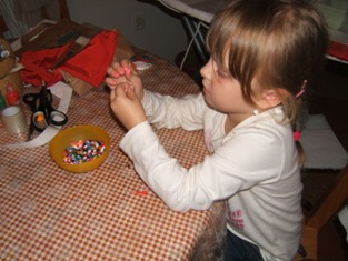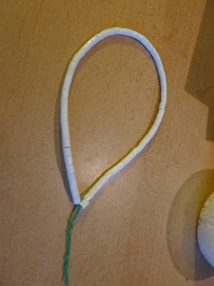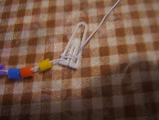 Na klobúkovú gumu natiahneme korálky a zviažeme. Uzlík sa väčšinou pekne schová pod nejakú korálku.