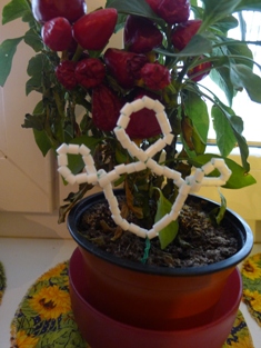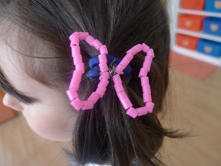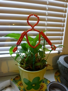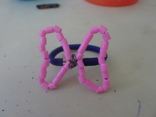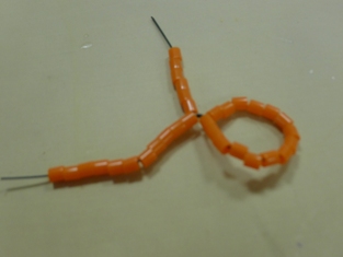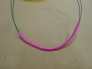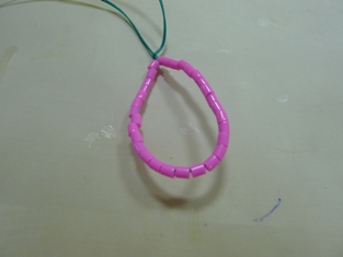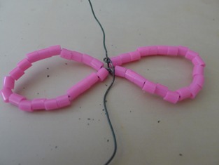 Najprv natiahneme ružové korálky na drôtik. Drôtik zauzlíme kúsok pod korálkami. Potom vytvarujeme rukami srdiečko.