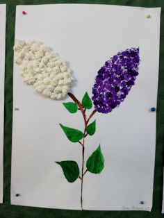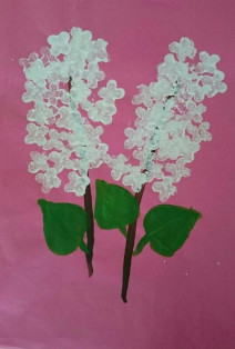 Na výkres namaľujeme farbami konáriky a listy orgovánu. Môžeme aj namaľovať konáriky a prilepiť vylisované listy orgovánu. Potom tavnou pištoľou prilepíme pukance do tvaru kvetu. Alebo vykrajovačkou na papier vystrihneme drobné kvietky, ktoré prilepíme na konáriky.