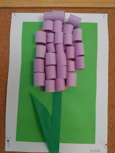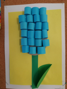Na biely výkres nalepíme farebný papier, ktorý má tvoriť pozadie obrazu. Mne sa viac páči zelené pozadie. Deťom sa viac páčilo žlté a oranžové. Z tmavozeleného papiera urobíme širokú stopku v podobe obdĺžnika a list, ktorý bude preloženým kruhom. Farebné pásy široké 3 cm a dlhé 8 - 9 cm natočíme na prste a zlepíme do tvaru valca, ktorý nalepíme na papier tak, aby sme vytvorili kvet.