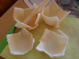 Tortové oblátky nakrájame na štvorce. V hrnci si necháme zovrieť vodu. Hrniec prikryjeme utierkou, na ktorú položíme oblátku. Oblátka vďaka teplu zmäkne. Okolo skleneného pohára ju potom vytvarujeme do misky. Necháme vychladnúť.