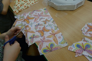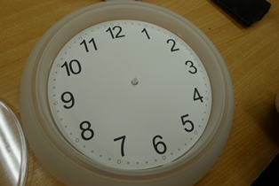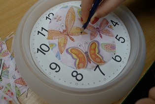 Vystrihneme si zo servítky obrázky a pomocou servítkového lepidla nanesieme na ciferník. Necháme zaschnúť a prelakujeme. Zase necháme zaschnúť. Založíme ručičky a môžeme zavesiť na stenu.