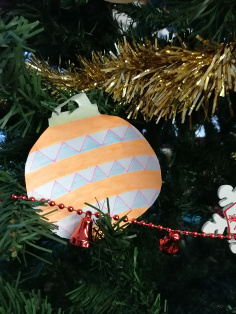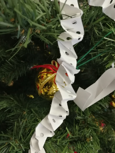 Na tomto stromčeku môžu spolupracovať menšie aj väčšie deti. Urobíme si vianočné guľe z tvrdšieho papiera. Nakreslíme ich na papier, pekne vyfarbíme. To zvládnu aj menšie deti. Väčšie či dospelý ich potom môžu vystrihnúť. Spoločne si urobíme pásiky papiera, ktoré zliepame do krúžkou a vytvárame reťaz. Druhú reťaz môžeme vytvoriť z dlhých tenkých pásov bieleho či farebného papiera prehýbaním. My sme ju vytvorili - možno si niekto ešte bude pamätať počítačové papiere, ktoré sme vkladali do ihličkovej tlačiarne a ich dierkované okraje, pomocou ktorých sa papier v tlačiarni posúval.