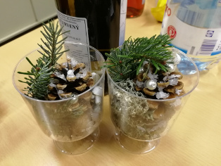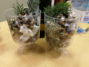 Z jednej oslavy zostali krásne umelé poháre. Môžeme ich použiť. Na dno položíme tenkú vrstvu drobných kamienkov, potom kúsok machu, šišku - na ktorú sme nalepili strieborné alebo biele korálky - a vetvičku. Môžeme trochu podliať vodou.
