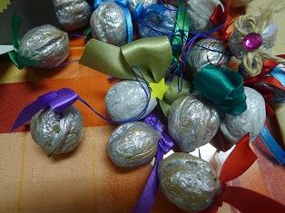 Ozdoby na stromček z prírodnín budú vždy atraktívne. Lepidlom na drevo zlepíme orechová škrupiny do tvaru hviezky a následne ich prelepíme hviezdou z kôry. Alebo ako na druhej fotografii. Zlepíme spolu s mašličkou škrupinky vlašských orechov. Všetko môžeme pekne zafarbiť podľa nálady.